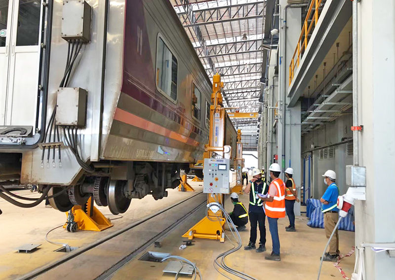 อุปกรณ์ยกรถไฟแบบซิงค์โครไนซ์ ใช้สำหรับการยกตัวรถไฟขึ้นและลง อุปกรณ์ยกรถไฟแบบซิงโครไนซ์สามารถทำการยกรถไฟได้พร้อมกันตั้งแต่การยกรถไฟ 1 คัน ไปจนถึงการยกรถไฟ 6 คันในการยกเพียงครั้งเดียว โดยใช้ผู้ปฏิบัติงานเพียงแค่ 2 คน ทั้งนี้ขึ้นอยู่กับการปรับเปลี่ยนเพื่อให้สอดคล้องกับความต้องการของลูกค้า โดยวัตถุประสงค์หลักของอุปกรณ์คือเพื่อใช้ในการซ่อมบำรุงอุปกรณ์ด้านล่างรถไฟ และเพื่อทำการเปลี่ยนแคร่ และชุดล้อของรถไฟ